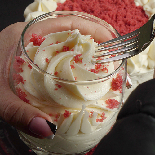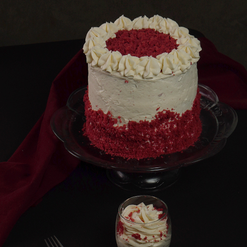 Pedir por WhatsApp Delicioso biscocho de Chocolate rojo relleno de delicioso betun de queso crema, decorado con la misma crema y polvo de pan.